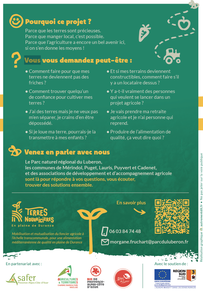 Le Parc du Luberon et l’association Au Maquis accompagnent les communes de Cadenet, Lauris, Mérindol, Puget et Puyvert pour mobiliser et mutualiser le foncier agricole à l’échelle transcommunale, pour une alimentation méditerranéenne de qualité en plaine de Durance.