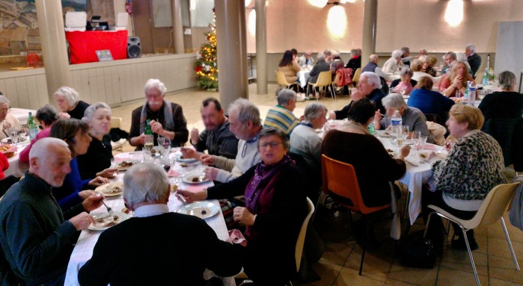 • lors du “repas des anciens” (organisé par 5 membres de l’Association des Commerçants pour 50 personnes) jeudi 7 janvier, avec la tombola (cadeaux offerts par certains commerçants), la daube et le gratin dauphinois de Albert, la galette de Christine et Christophe, l’animation musicale de Benjamin, la vaisselle de JEM les jolies vieilleries et le studio photo de l’Atelier de Curiosités !